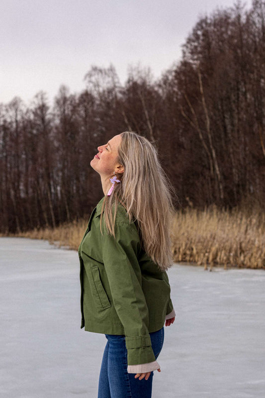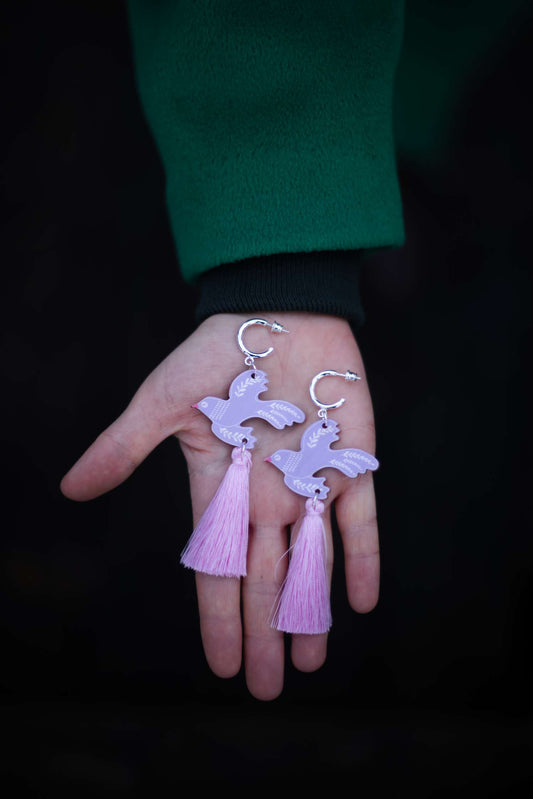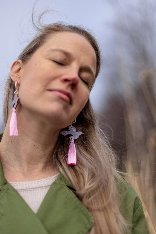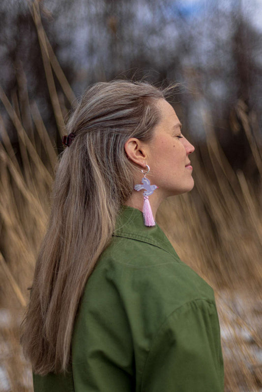 Lyyli-korvakoru on väriltään lempeän laventeli vaaleanpunaisilla tasseleilla. Koruun halusimme uniikin hoopia muistuttavan, mutta samalla helppokäyttöisen korunosan. Koru kiinnittyy laadukkaalla ja miellyttävän tuntuinen hopealukolla.